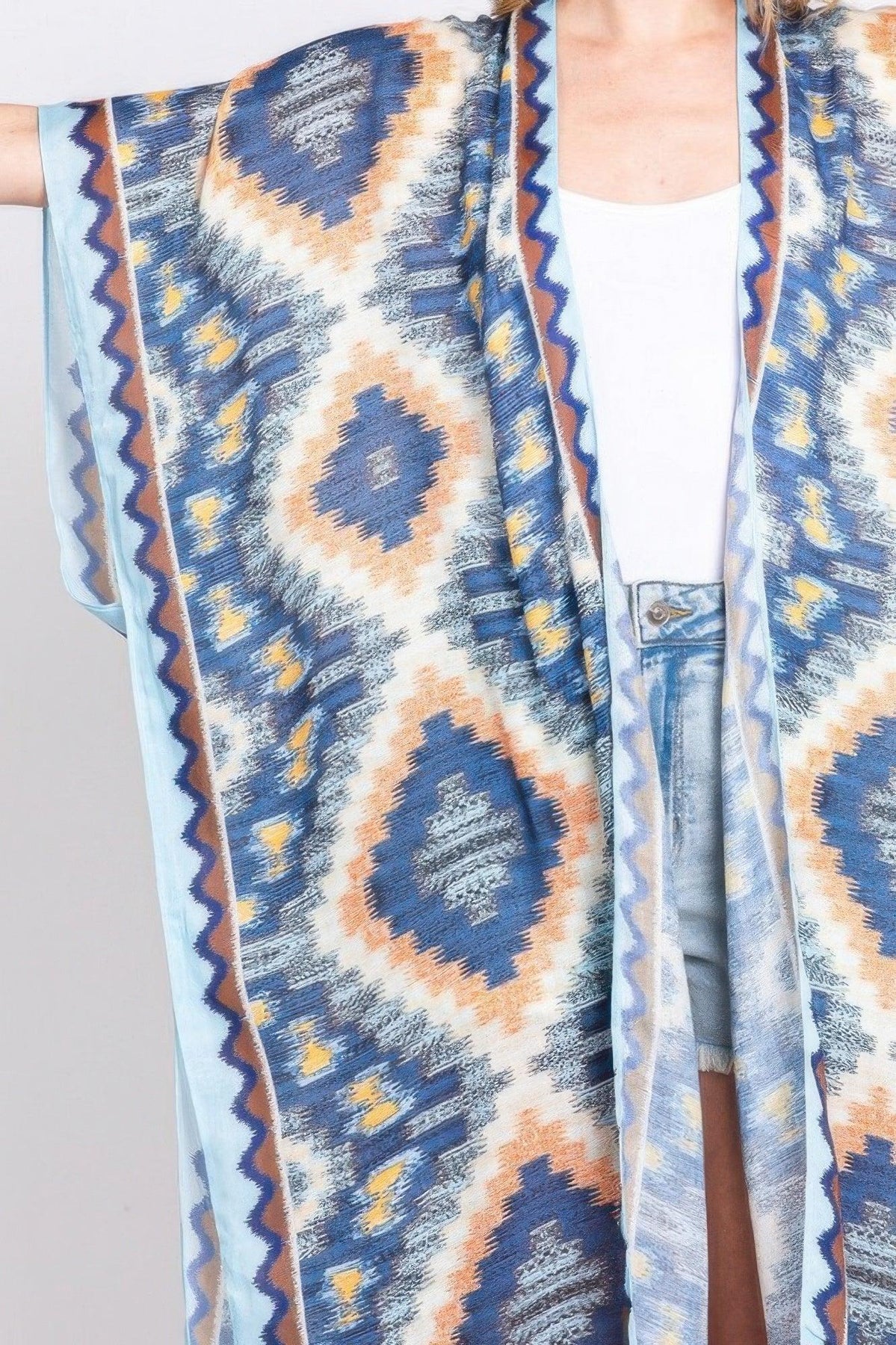 Each order includes your carefully packaged aztec print open front long kimono, ready to enhance your collection.