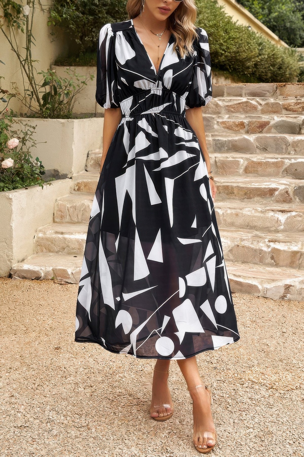 Product Description: With its free-spirited charm and flattering silhouette, this bohemian-inspired midi dress is perfect for effortless everyday style. Made from 100% viscose, it offers a lightweight, breathable feel that's ideal for warm weather. The V-neckline and elastic waist create a figure-enhancing shape, while the flowy midi length adds graceful movement. Whether you're heading to a weekend market, a beach vacation, or a casual brunch, this dress brings easy elegance to every outing. It's a relaxed essential with boho flair.