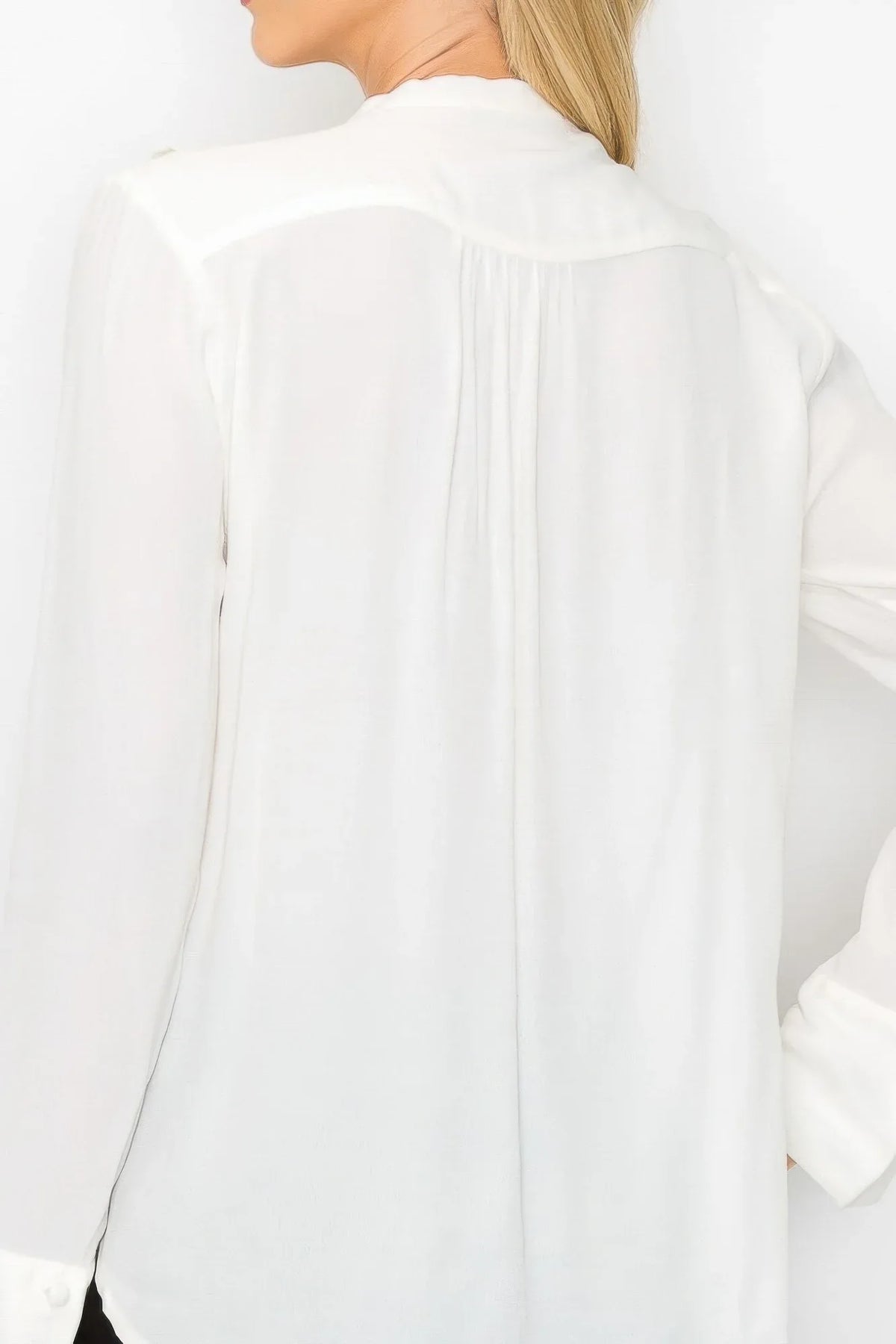 Each order includes your carefully packaged ruffle detail front tie v-neck long sleeve blouse, ready to enhance your collection.