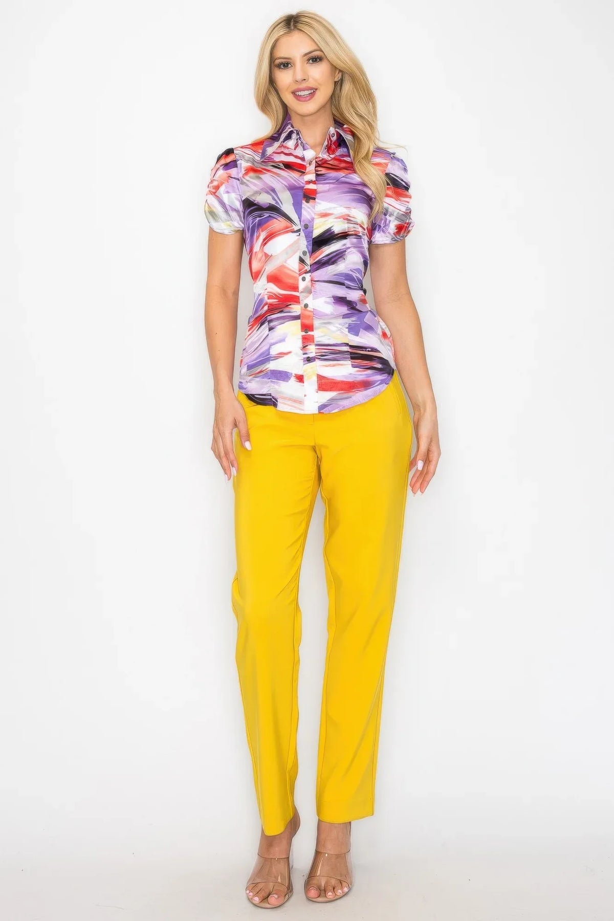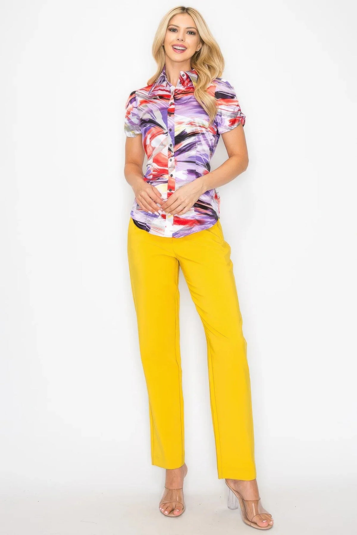 Introducing the Belted Short Sleeve Snap Button Watercolor Blouse - your new favorite product from Pantera Stores.