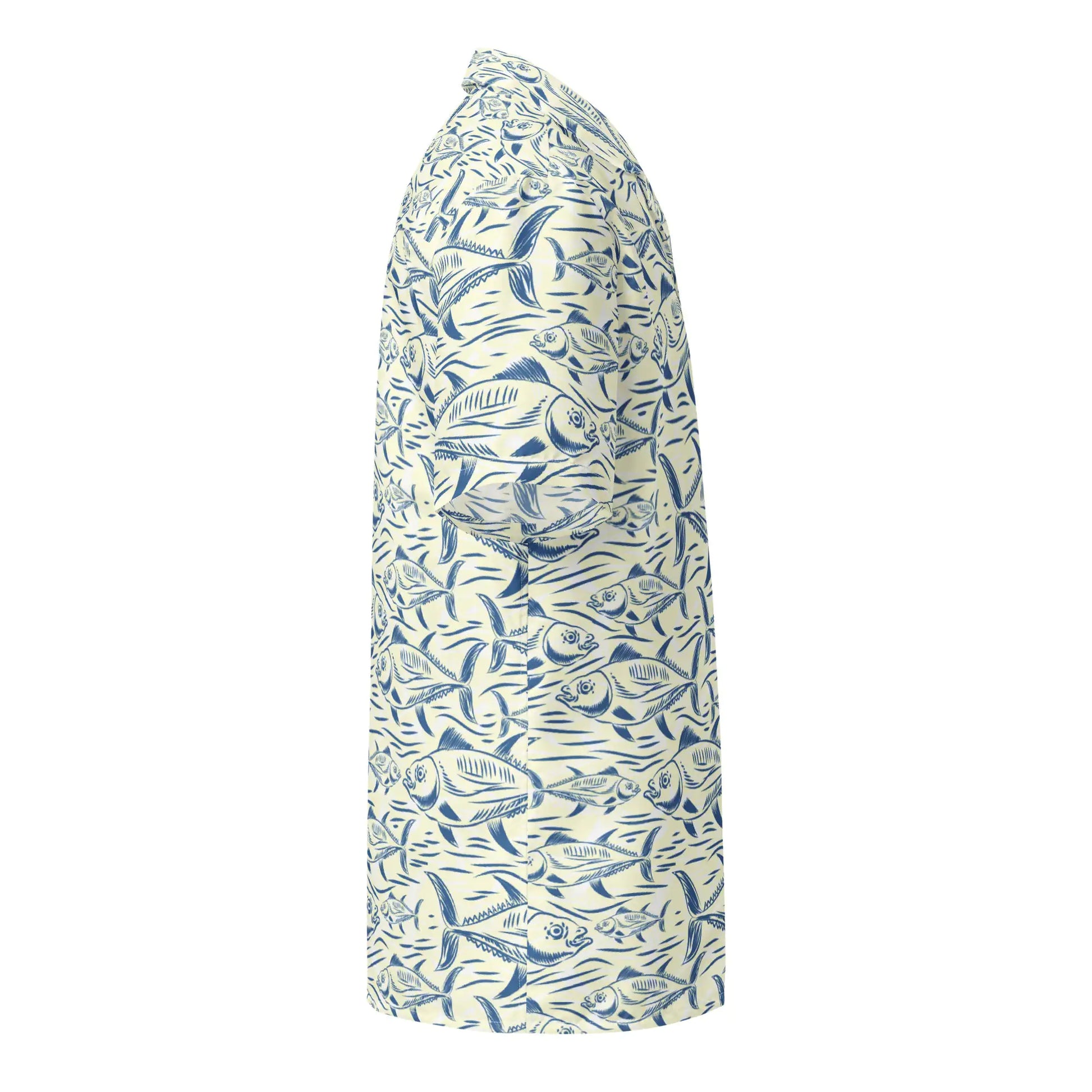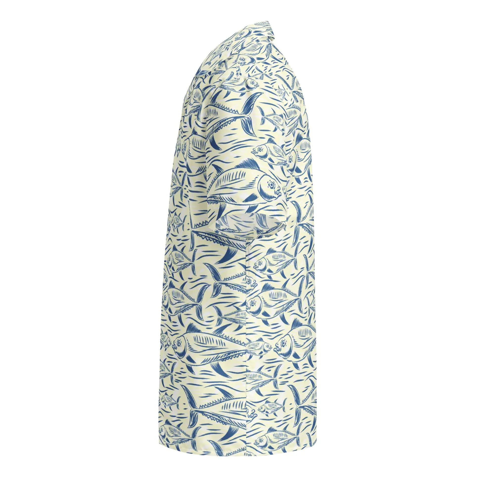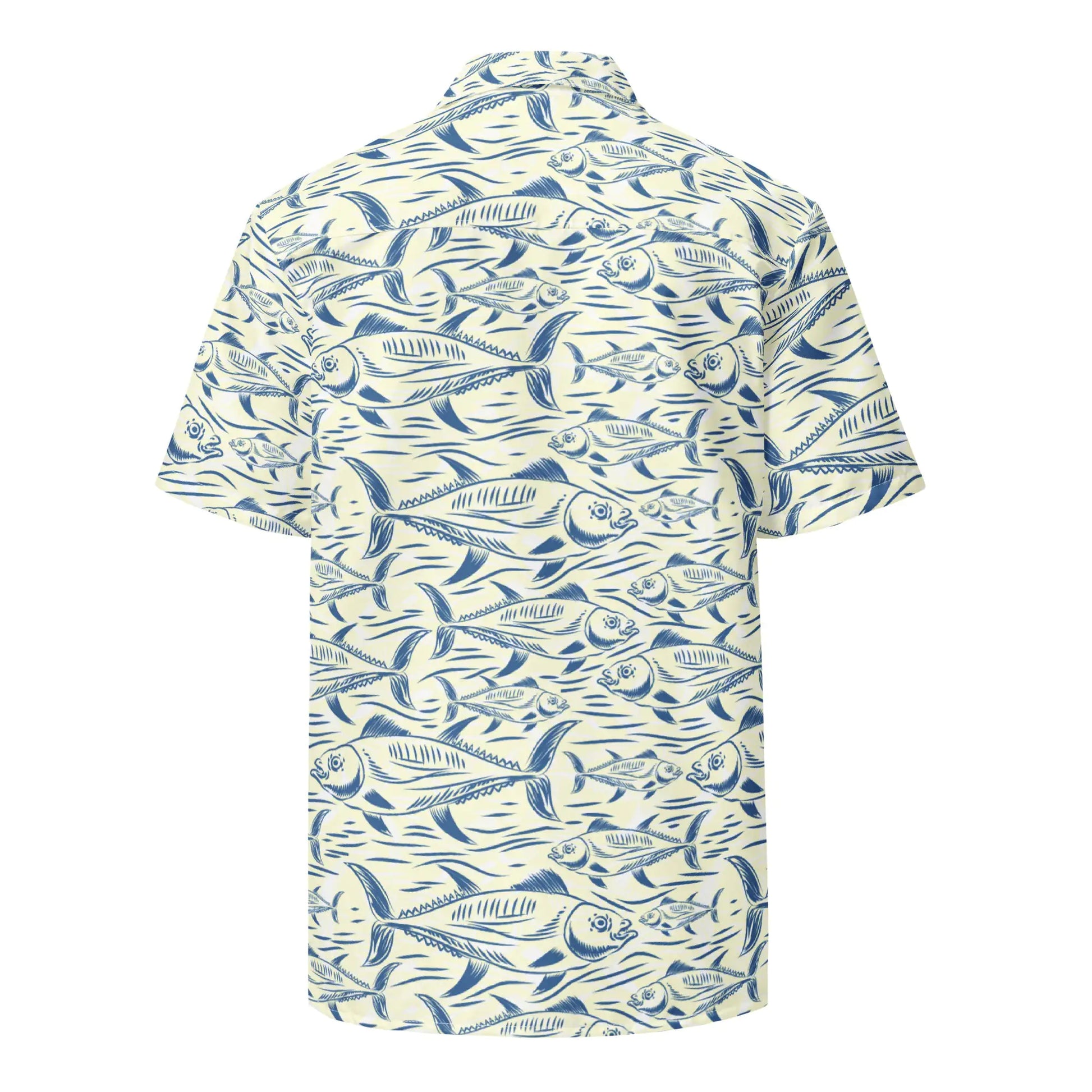 Part of our IslandLux Vacation Collection - Introducing the Bonito Island Hawaiian Button Shirt. This yellow cream-colored button shirt, adorned with a captivating dark blue and white tuna pattern print, invites you to dive into nautical elegance. Crafted from of 65% recycled polyester, this shirt is a symphony of style, sustainability, and oceanic allure.