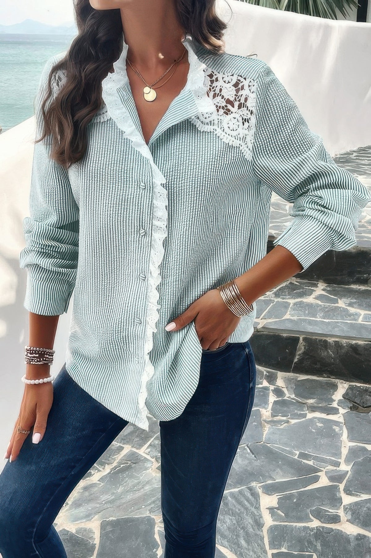 This colorblock guipure lace insert button front shirt is a sophisticated yet playful addition to your wardrobe. Crafted from 100% polyester, it’s lightweight and comfortable, perfect for layering or wearing on its own. The colorblock design adds a modern twist, while the guipure lace inserts bring a touch of feminine elegance. Finished with a button front closure, this shirt is easy to style and ideal for everything from casual workdays to relaxed weekends. Pair it with your favorite jeans or tailored pants for a polished, confident look.