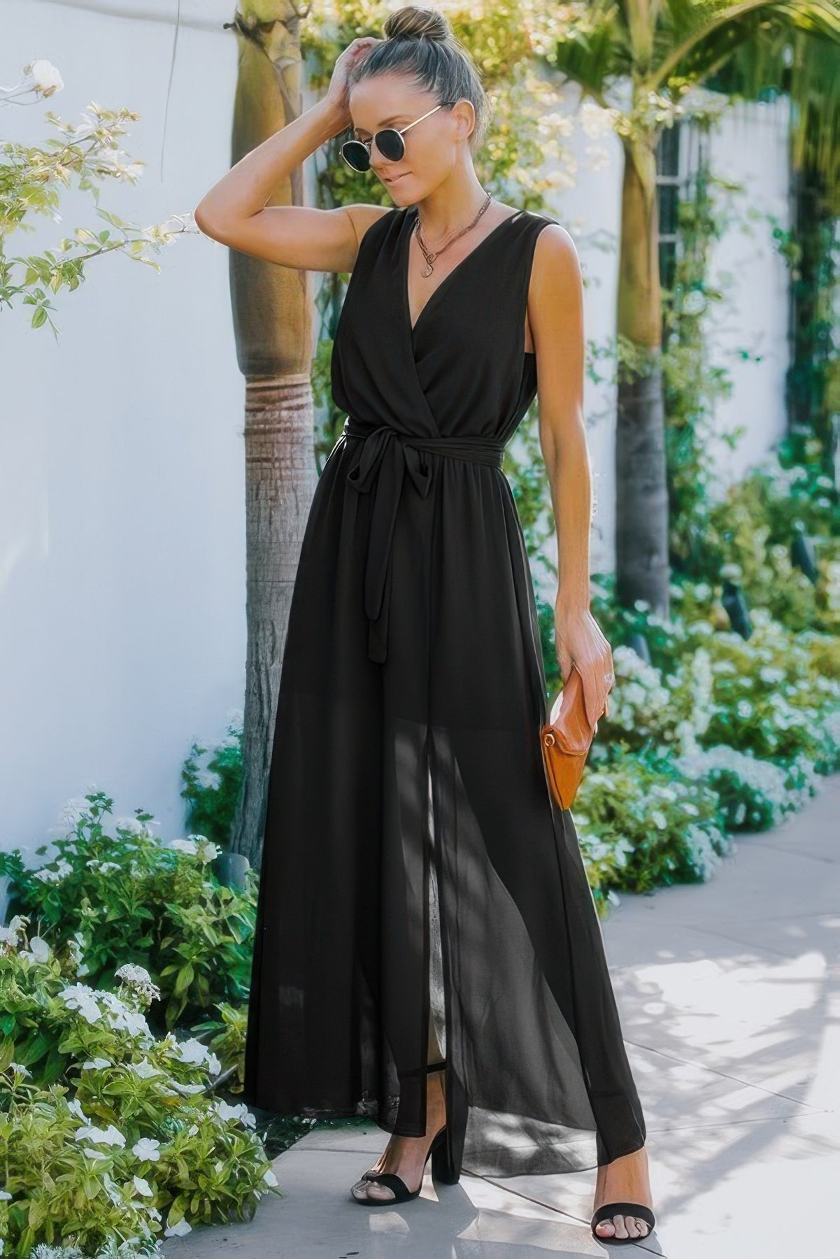 • Solid Cross V Neck Sleeveless Tie Waist Split Dress for added style and flair