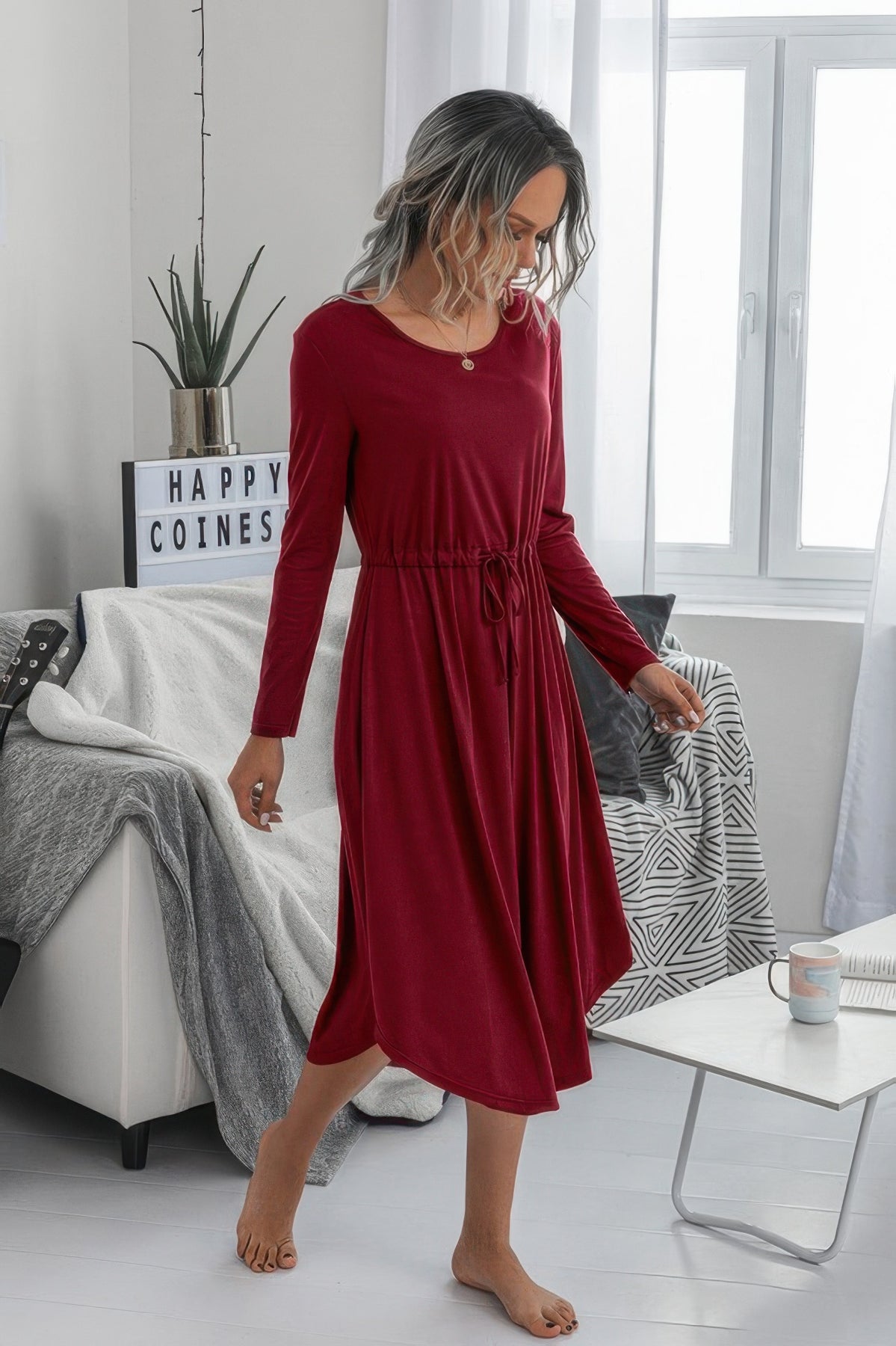 Solid Round Neck Long Sleeve Drawstring Dress