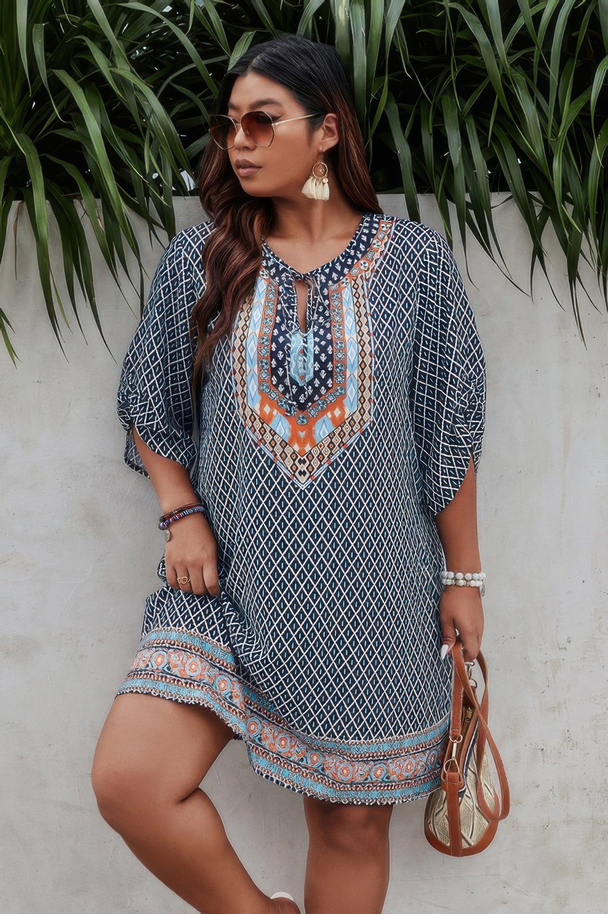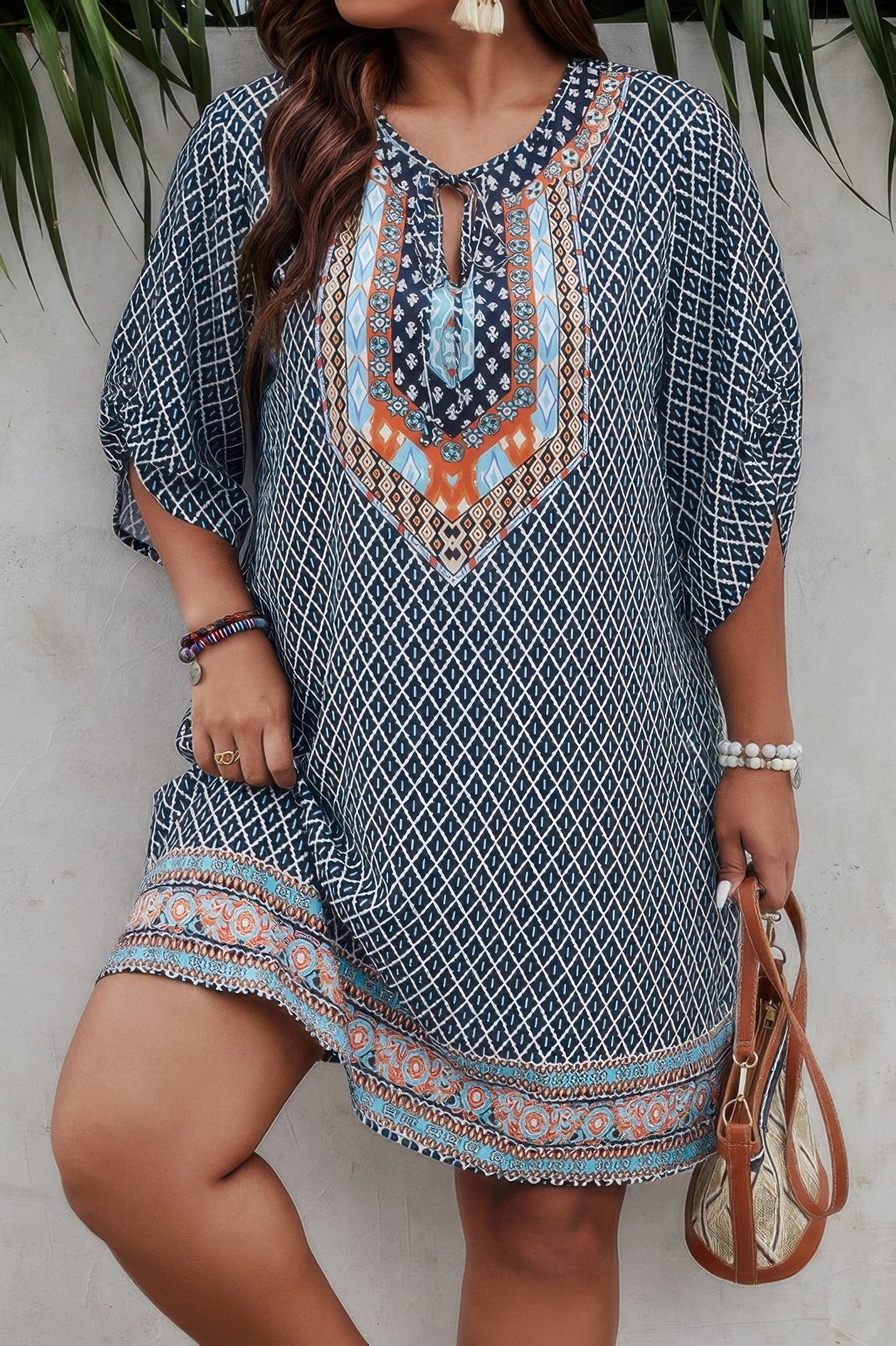 This plus size V-neck printed loose fit midi dress is a versatile and easygoing piece for your everyday adventures. Made from a soft, stretchy blend of 95% polyester and 5% elastane, it offers a lightweight and comfortable feel that moves with you. The V-neckline creates a flattering shape, while the loose fit drapes beautifully over your figure for a breezy, relaxed silhouette. With its playful print and midi length, this dress is perfect for casual outings, vacations, or just enjoying the day in style.