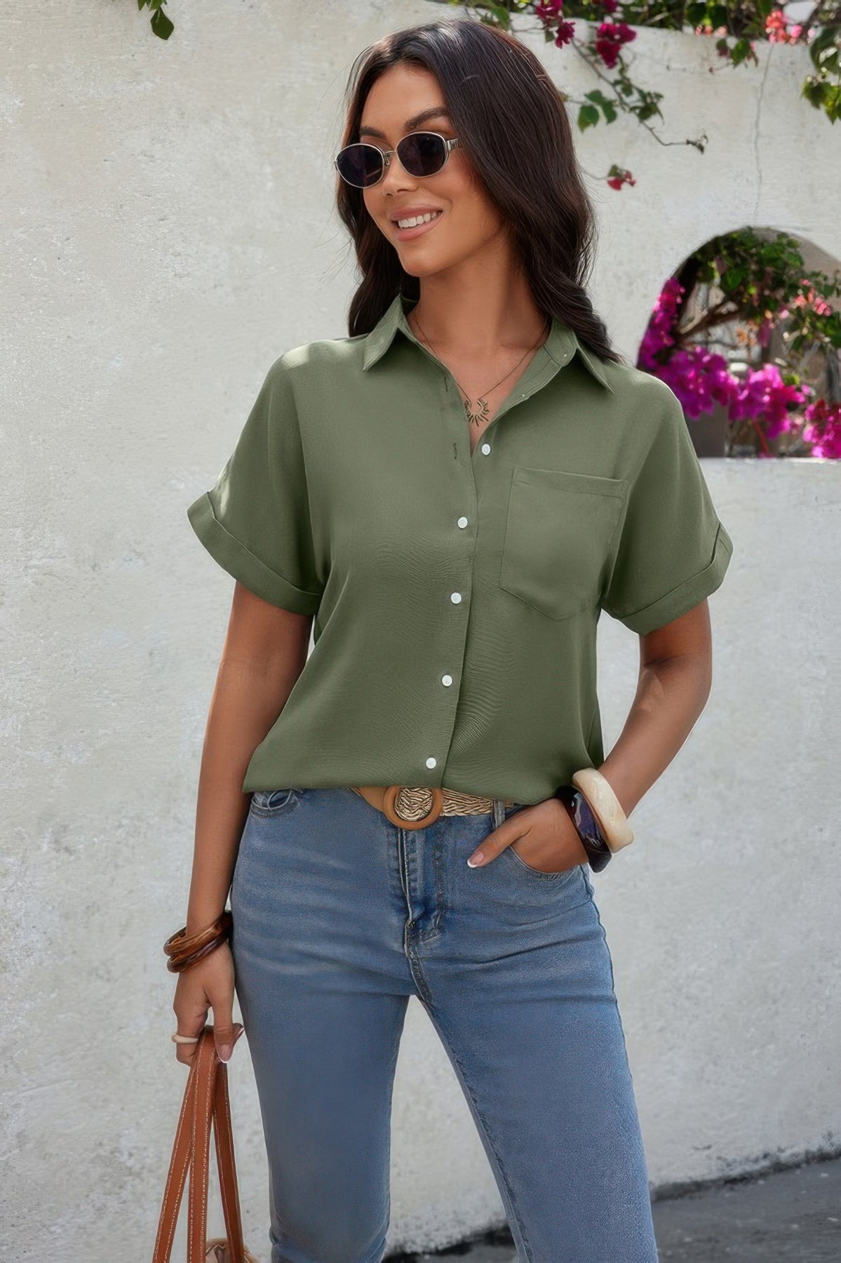 Solid Short Sleeve V Neck Button Down Tunic Shirt