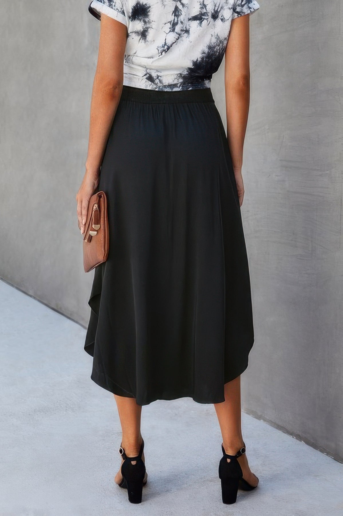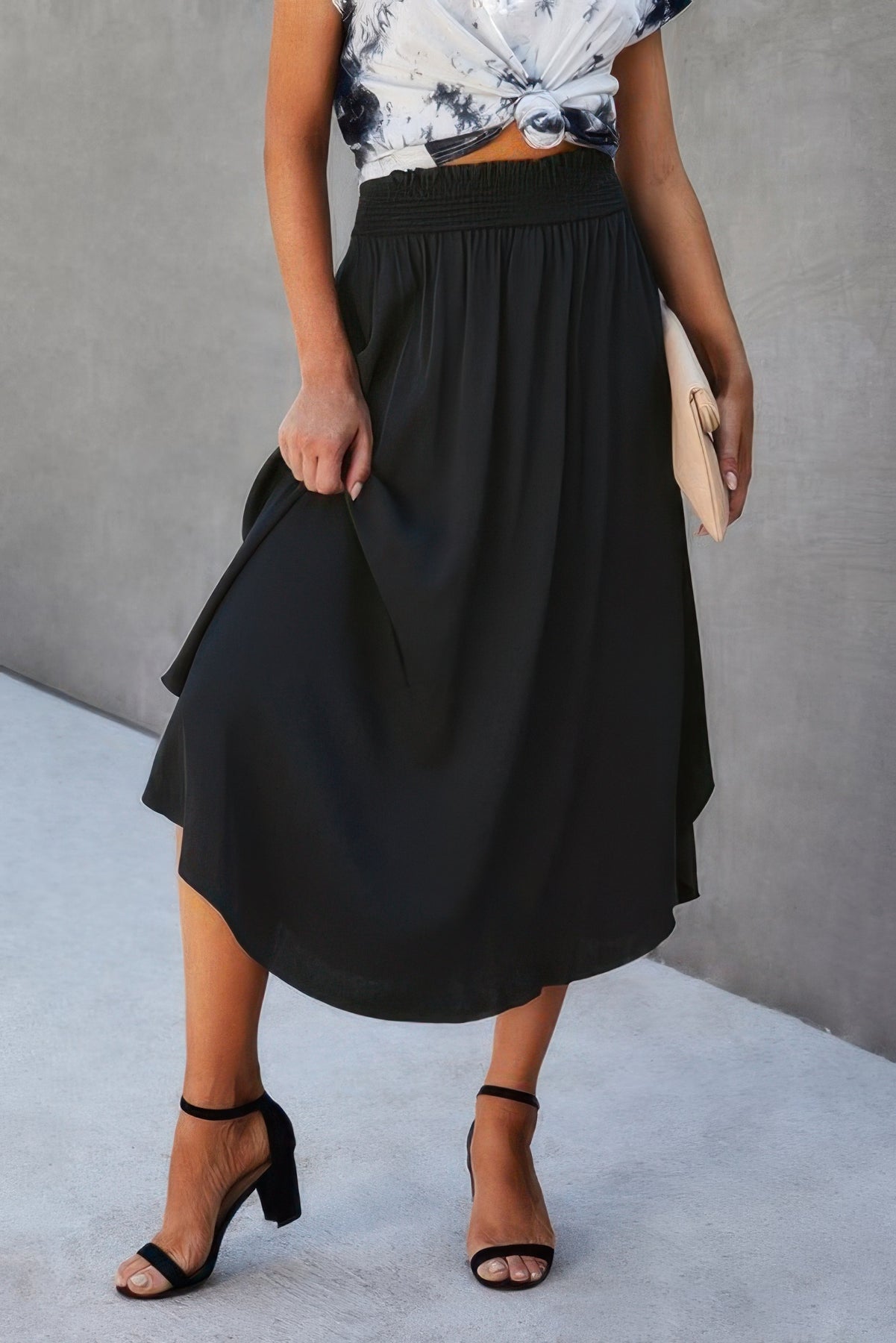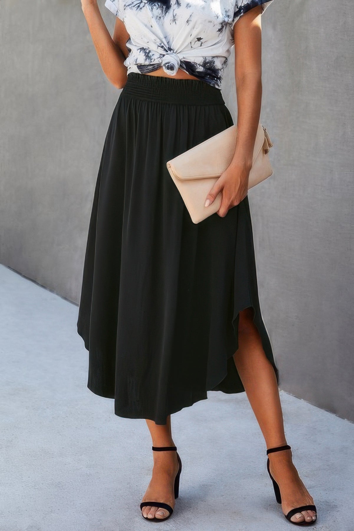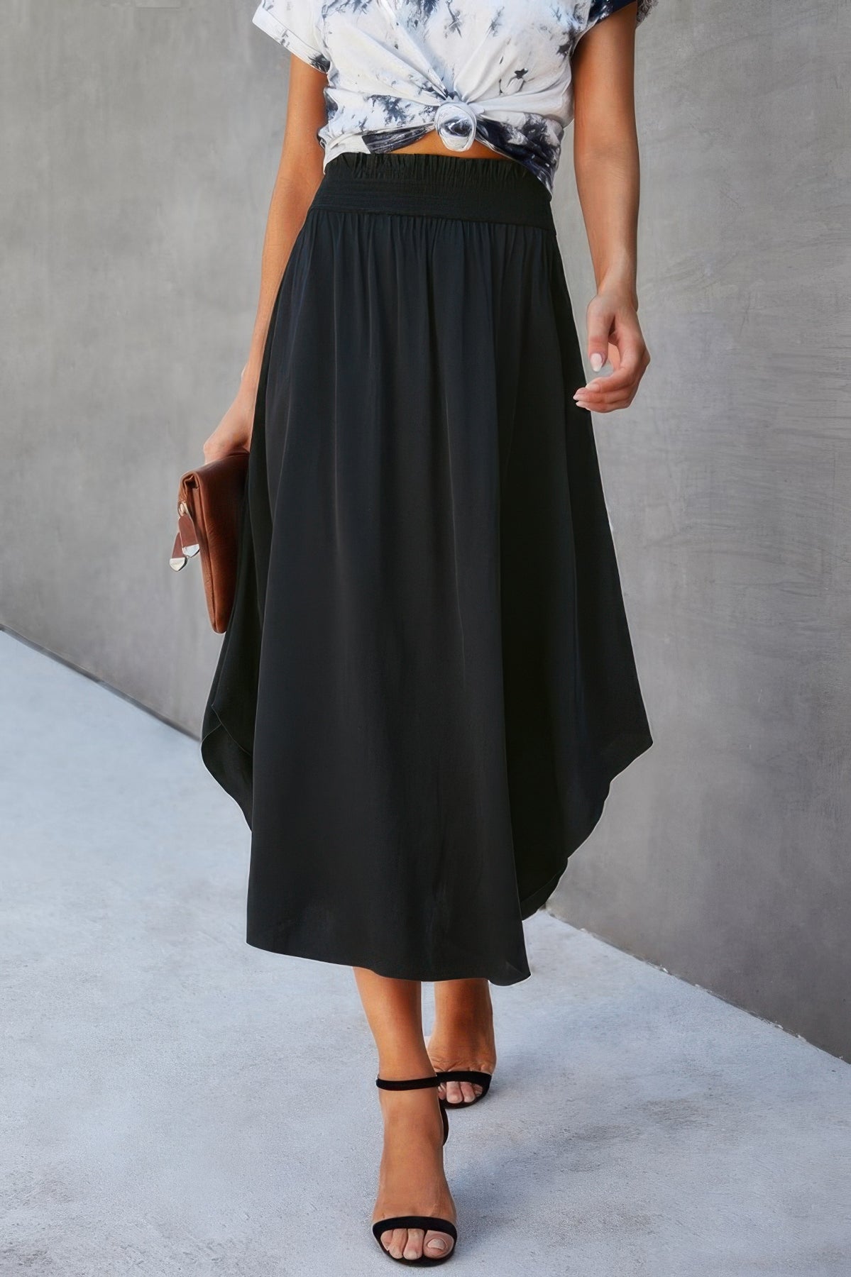 Solid Shirred Waist Asymmetrical Hem Flared Skirt