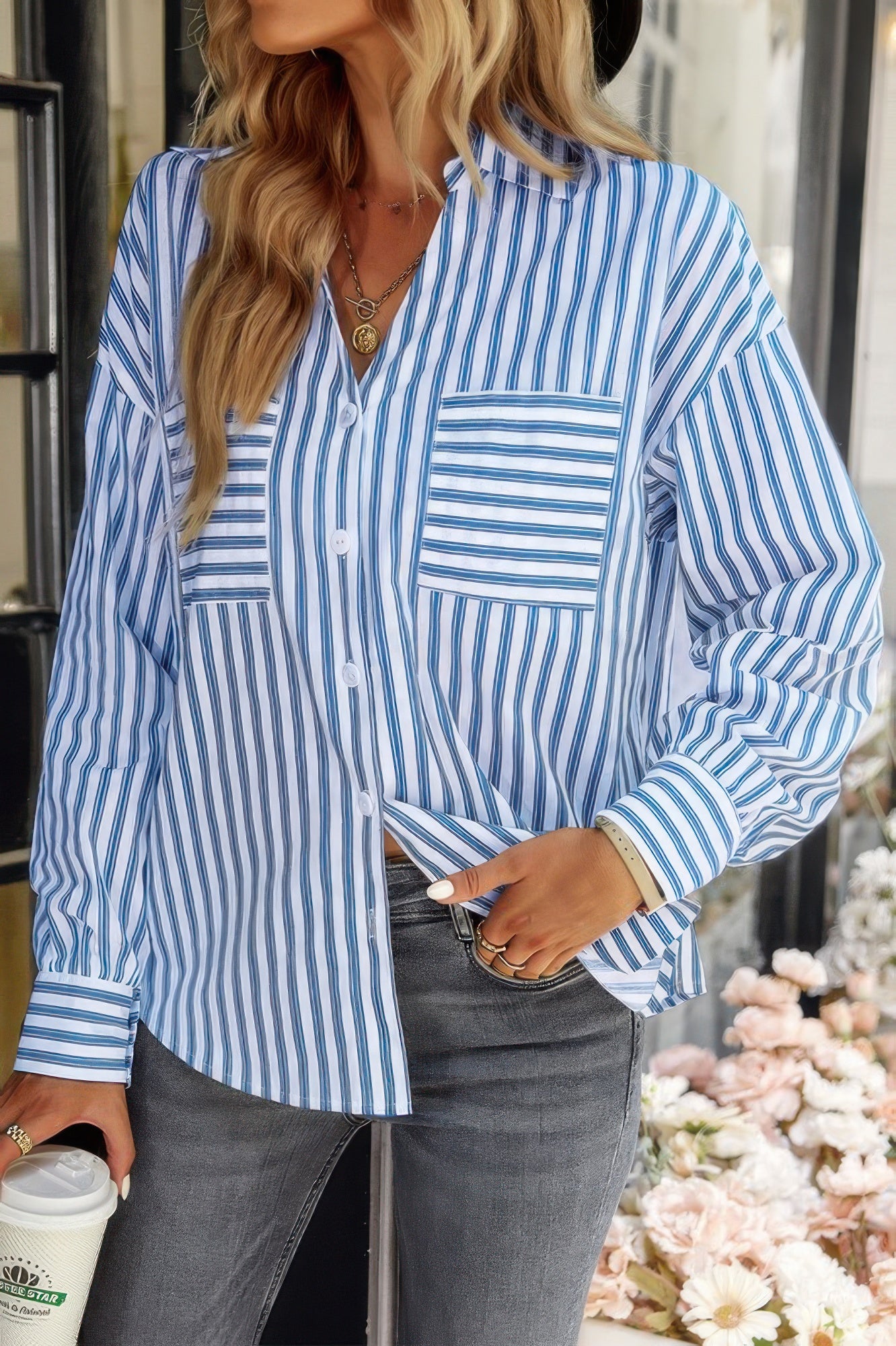V Neck Striped Button Down Pocket Long Sleeve Blouse