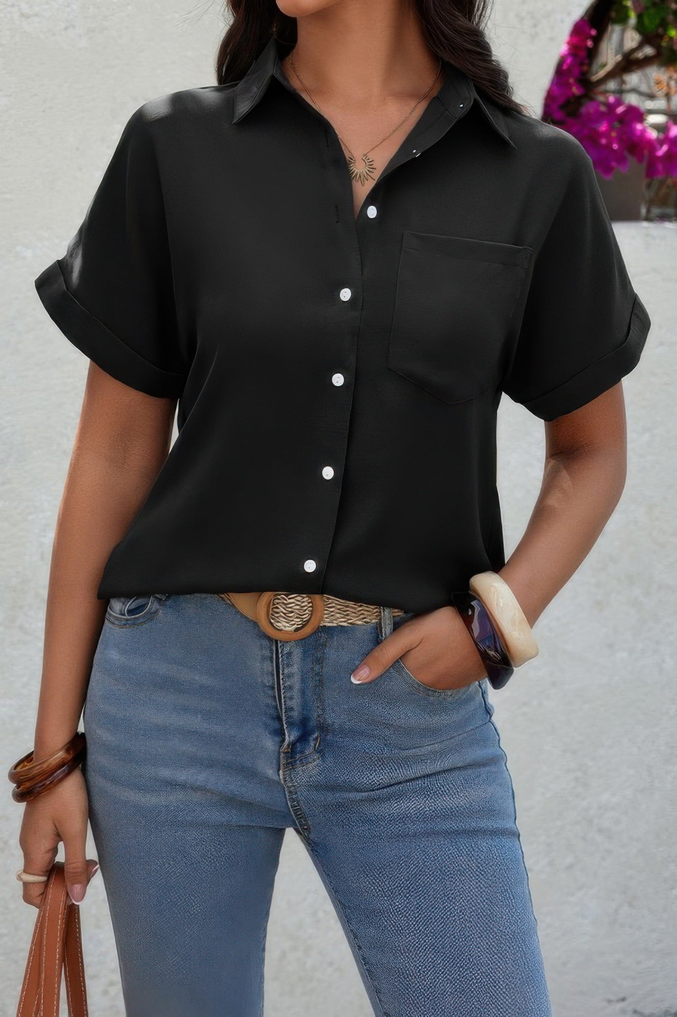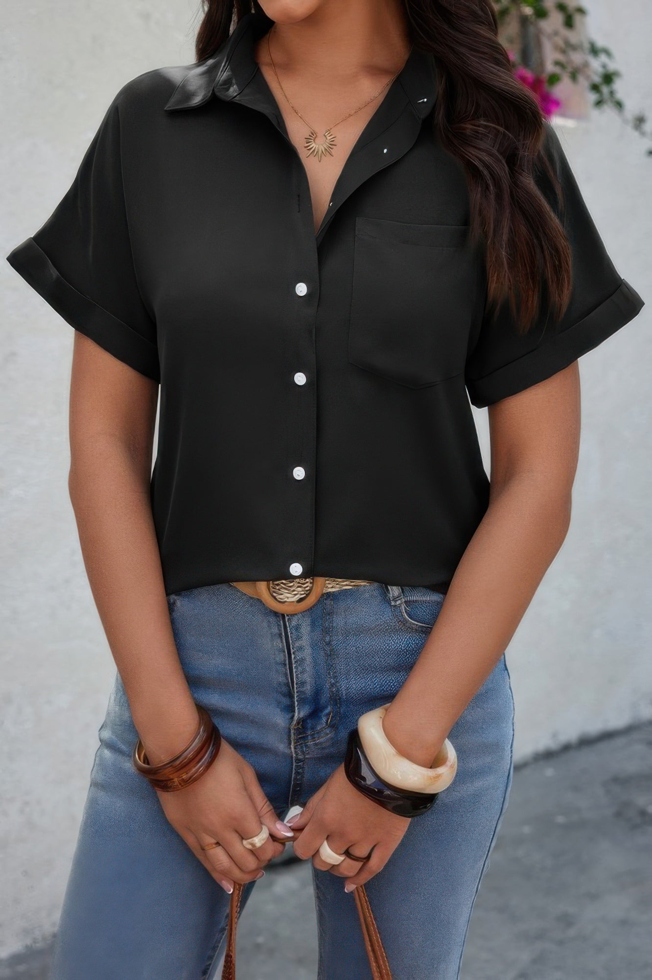 Solid Short Sleeve V Neck Button Down Tunic Shirt